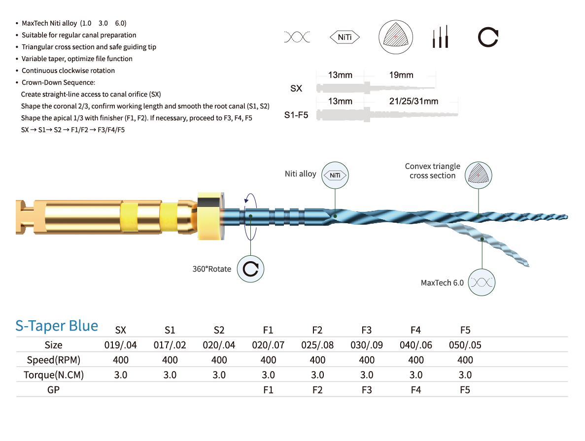 l Made with MaxTech 6.0 Nickel-titanium alloy technology,the surface of the file needle appears blue. l The file is flexible and can be prebent. l Triangularsection