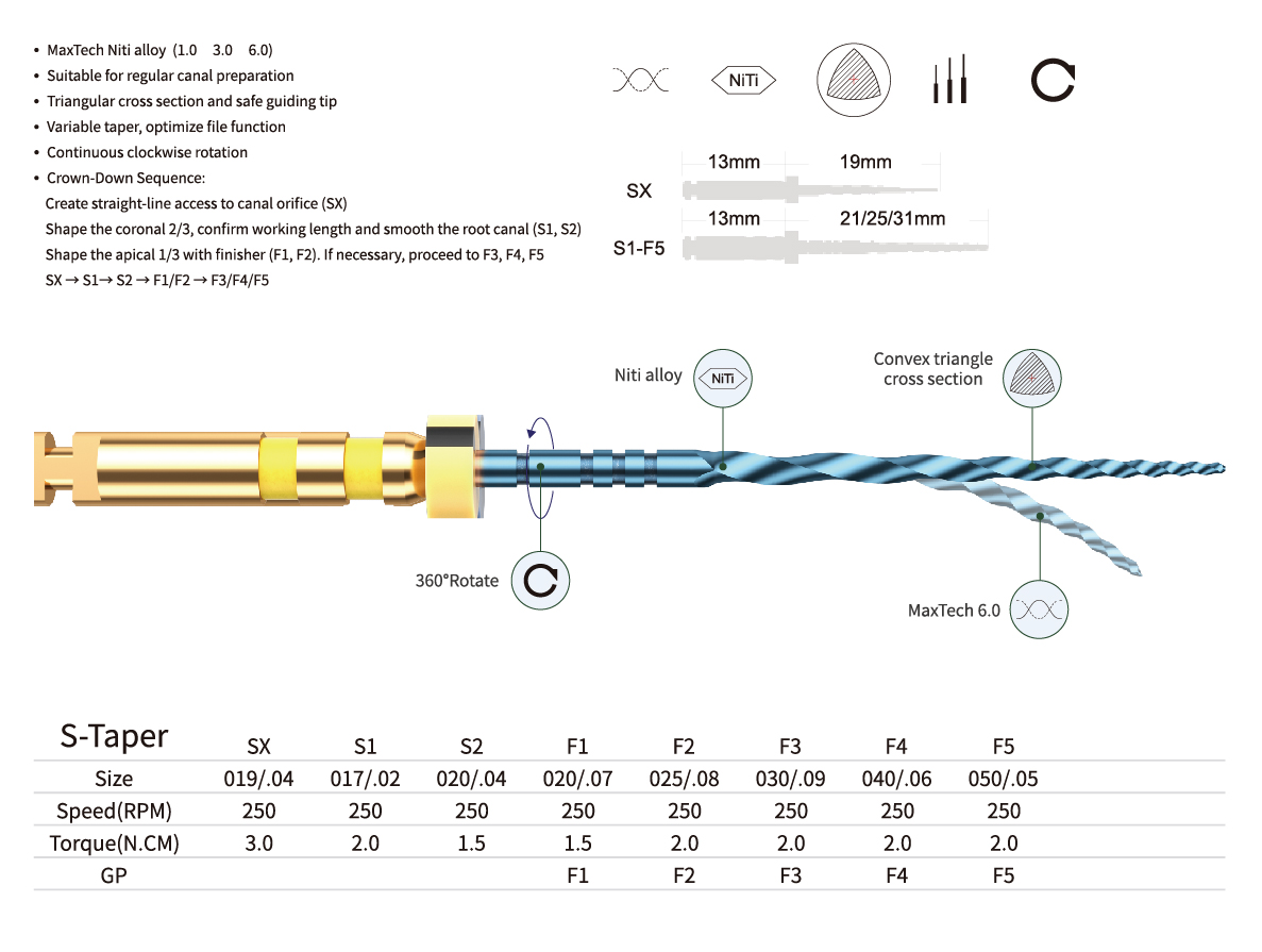 Made with MaxTech Nickel-titanium alloy technology. Triangularsection and Safe guiding tip Variable taper design, Suitable for regular canal preparation with Crown Down Tech
